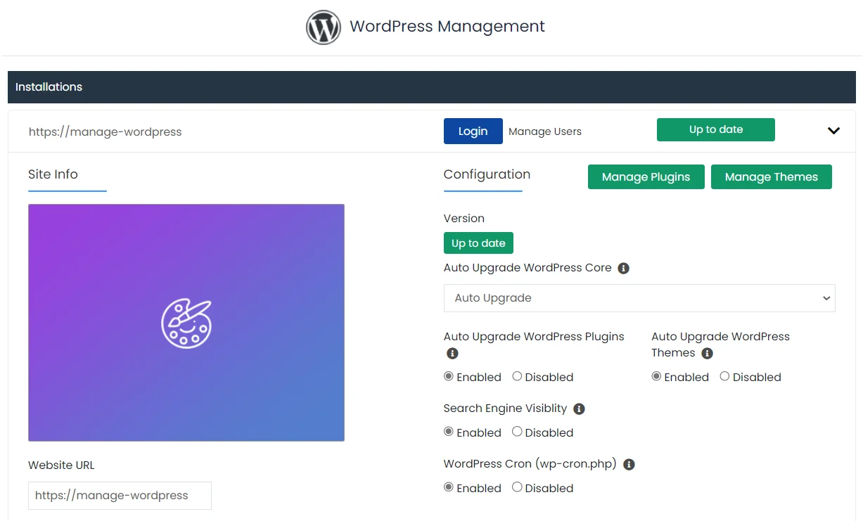 A very important feature that WordPress Manager offer's is to auto update your WordPress core, themes and plugins so that you get the latest features and security patches. This offers you a worry free WordPress experience where you can focus more on your business while the security patches are being automatically applied.